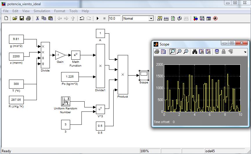 El presente diagrama muestra el cálculo de potencia que el viento produciría en el caso ideal de que éste interactué con un turbina eólica. Debido a lo variante que es el viento, se puede observar que la potencia es también variable.