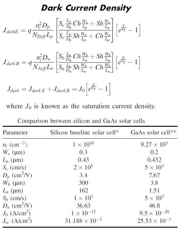 La curva de voltaje – corriente oscura es enteramente similar a aquella de un diodo convencional. La curva resultante voltaje – corriente tiene dos componentes: emisor y base, similar a la densidad de corriente de cortocircuito mostrado en otra entrada.