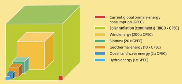 Se encuentra diversos datos sobre la capacidad de las energias renovables frente a las actuales necesidades de consumo de energía de la humanidad. Pienso que esta figura da una idea mejor de la cantidad disponible. Considero que hacer este cambio de matriz energética hacia las renovables, implica también negocios de muy alta cantidad de dinero. Imposible pensar en terminar el abastecimiento de petroleo. Algunos pronósticos, eliminan el consumo de petróleo en 20 años, otros, lo mantienen en una cantidad menor a la actual, pero siempre habrá petróleo.