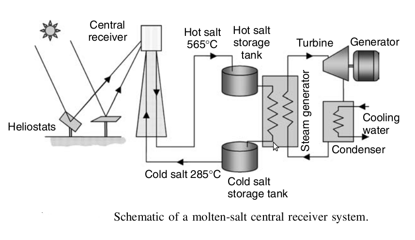 Explicamos a continuación el diagrama de la central. Se tiene que este tipo de central tiene muchos muchos espejos que adecuamente controlados y dispuestos reflejan la radiación solar hacia la parte alta de una torre en donde se ha instalado una caldera. En esta caldera es calentado un fluido operante que al salir de la torre es almacenado en un tanque, para que cuando sea necesario, es derivado hacia un intercambiador de calor en donde cede parte de su calor hacia un segundo circuito con agua, que lo vaporiza e ingresa a una turbina de vapor de agua, la cual acciona un generador. Ambos fluidos se desplazan en su propio circuito y retornan su ciclo.