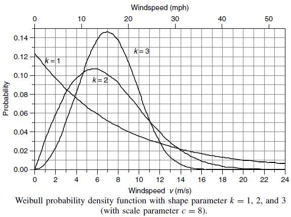 Una muy general expresión que se frecuentemente usada como un punto de partida para caracterizar las estadísticas de la velocidad de viento es la llamada: función de densidad de probabilidad de Weibull. dicha función se le hace los ajustes necesarios para que se parezca en lo posible a la curva continua encontrada con los valores discretos de velocidad de viento. Pero la práctica e intuición nos dice que la función tiene por lo general una característica ya establecida que deviene en otra función conocida (de Rayleigh) que lo posteo en la sigueinte entrada.