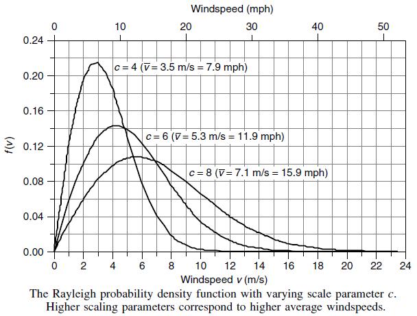 En cierto valores como k=2 y c=8, la curva que se obtiene una curva que se asemeja mucho a las curvas encontradas con valores reales de viento (medidas discretas), entonces a esta curva que describe un comportamiento semejante a la velocidad de viento de la zona se le denomina: función de densidad de probabilidad de Rayleigh. Con la función de Rayleigh adecuadamente calculada para describir el viento en la zona de estudio, se puede obtener la velocidad promedio mediante la integración de la velocidad de viento por la función de densidad de probabilidad encontrada y con unos cálculos adicionales se puede llegar a encontrar una equivalencia entre el parámetro «c» y la velocidad promedio de viento.