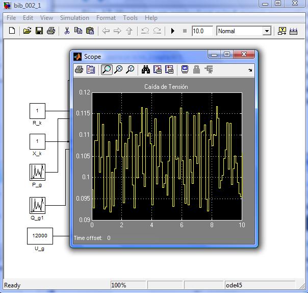 Se hizo el modelamiento de esta configuración y luego la simulación que puede ser modificada según lo que se desea analizar, ambos en Matlab/Simulink, lográndose un resultado equivalente al mostrado en la segunda figura variando obviamente el ángulo, el resultado de la simulación se da en la siguiente figura: