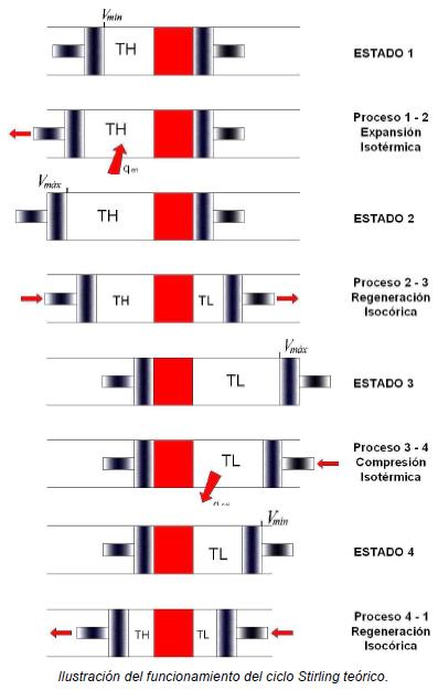 Inicialmente el fluido de trabajo (gas) se encuentra en la cámara de la izquierda (zona caliente) que se encuentra a alta temperatura (TH). En el proceso 1 – 2 se recibe calor a temperatura TH y se consigue la expansión del gas, y el movimiento del émbolo de la izquierda hacia afuera. Durante el proceso 2 – 3 se mueve simultaneamente el émbolo izquierdo y derecho hacia la derecha, manteniendo constante el volumen y obligando al aire a pasar por el regenerador para enfriarse hasta la temperatura baja TL y a ubicarse en la zona de enfriamiento. En el proceso 3 – 4 se produce la entrega de calor al sumidero externo a baja temperatura TL obteniéndose como resultado una compresión del volumen de aire y el movimiento hacia adentro del émbolo de la derecha. Finalmente, en el proceso 4 – 1 se mueven los dos émbolos hacia la izquierda con la misma velocidad para mantener la temperatura constante y para obligar a pasar al aire a través del regenerador recuperando la energía antes almacenada e incrementando la temperatura del aire hasta TH.