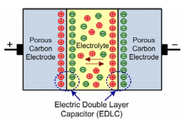 Los llamados supercapacitadores, ultracapacitadores o electric double layer capacitors (EDLC) consiste de una estructura porosa de carbón activado para uno o ambos electrodos, el cual están inmersos dentro de una solución electrolítica (típicamente hidróxido de potasio o ácido sulfurico) y un separador que previene el contacto físico de los electrodos pero permite la transferencia de iones entre ellos. Esta estructura efectivamente crea dos capacitores equivalentes (entre cada electrodo y el electrolito) conectado en serie, como se muestra en la figura esquemática de sus componentes internos.