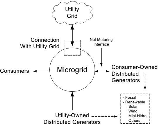 En general, una microgrid comprende la parte de media tensión (MV) y baja tensión (LV) de un sistema de distribución eléctrico. En los casos en donde la red eléctrica principal existe, la microgrid cierra el lado secundario de las subestaciones de transformación (llamado PCC) al resto del sistema MV y LV. Esta puede incluir cargas, generadores distribuidos tanto de la empresa eléctrica como de los usuarios, los cuales pueden ser de diferentes tipos y tecnologías. La microgrid también incluye todos los equipos de comunicación necesarios para la operación y gestión de la energía en tiempo real del sistema. La figura ilustra la estructura general de una microgrid.