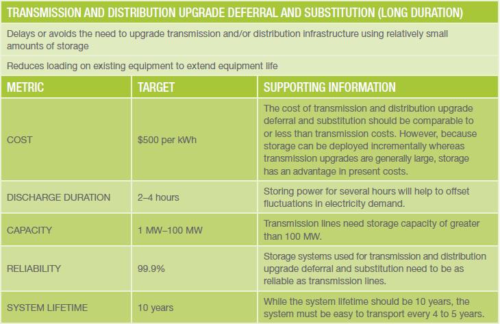 El costo es lograr sea US$ 500 por kWh, el costo de transmisión y distribución retrasada o substituida es comparable o menor que los costos de transmisión; sin embargo, debido a que el almacenamiento puede ser intencionamente incremenado mientras que en la transmisión las actualizaciones son grandes y por lo tanto, el almacenamiento tiene una ventaja en los costos. La duración de la descarga de 2 – 4 horas, que permiten compensar fluctuaciones en la demanda de electricidad. La capacidad anda entre 1 MW – 100 MW, sin embargo, las líneas de transmisión necesitan capacidades de almacenamiento mayores a 100 MW. Fiabilidad del 99.9%, dado que para los fines enmarcados en estas aplicaciones se necesita tener un sistema de almacenamiento tan fiable como las líneas de transmisión. Tiempo de vida del sistema de unos 10 años.