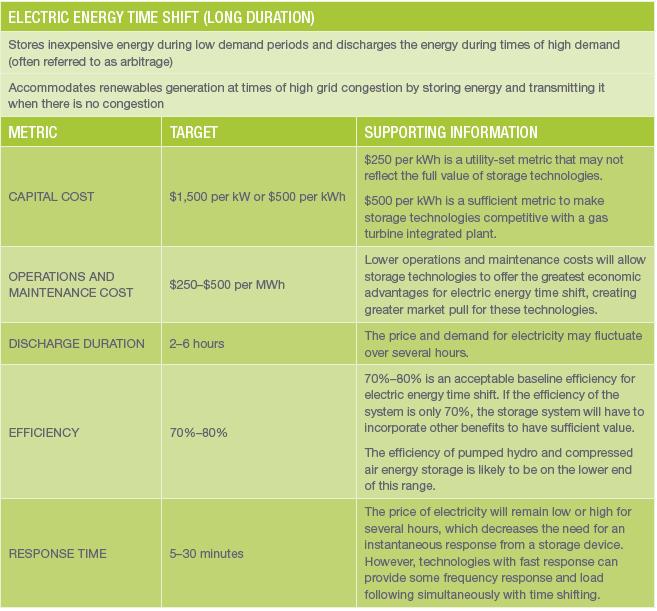 Los costos de capital esta por US$ 1500 por kW ó US$ 500 por kWh, de donde US$ 250 por kWh es para el conjunto de empresas que no reflejan el valor total de las tecnologías de almacenamiento y de US$ 500 por kWh es una suficiente medido para hacer las tecnologías de almacenamiento competitivas con las plantas de generación a turbinas de gas. Los costos de operación y mantenimiento son entre US$ 250 – US$ 500 por MWh, bajos costos de operación y mantenimiento pueden permitir que las tecnologías de almacenamiento sean ofrecidas a las mejores economías para «electric enery time shift», creando un gran mercado para estas tecnologías. Duración de la descarga entre 2 – 6 horas, pero hay que considerar que el precio de la electricidad puede fluctuar en varias horas. La eficiencia es esta entre 70% – 80% que es una buena base para «electric energy time shift», si la eficiencia del sistema es solo 70%, el sistema de almacenamiento debe incorporar otros beneficios para tener un valor suficiente. El tiempo de respuesta de 5 – 30 minutos, pero repetimos que el precio de la electricidad puede permanecer bajo u alto por varias horas, el cual disminuye la necesidad para una respuesta instantánea desde un dispositivo de almacenamiento, sin embargo, tecnologías con rápida respuesta pueden dar una respuesta en la frecuencia y carga simultaneamente con el «time shifting».