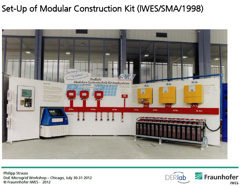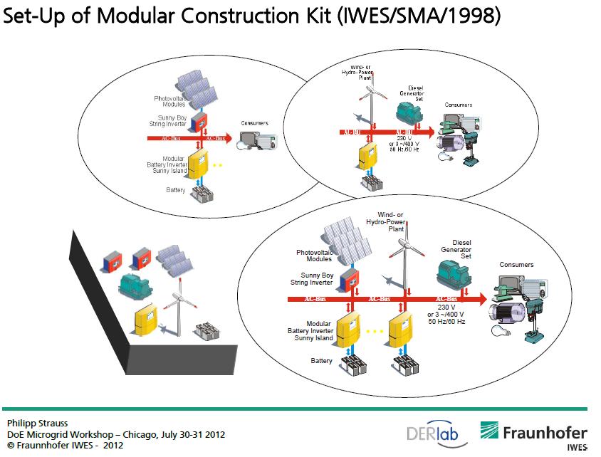 Presentado en una conferencia internacional en el 2012, desarrollado en Alemania. Se observa que la caraacterística principal es la de tener un gran bus único de transporte de la energía eléctrica a la cual se acoplan todos los elementos (generadores, almacenadores, consumidores) de la microgrid. El bus es del tipo AC (Corriente Alterna) por lo tanto, si es que se tiene generacíón renovable envoltaje continuo, éste debe tener un convertidor DC/AC para acoplarse al bus. Dicho inversor debe tener diseño adecuado para hacer seguimiento de los cambios de frecuencia y voltaje del bus a fin de obtener una buena performance del sistema, cosa que supongo se ha realizado y muestra de ello, en la figura inferior se tiene un demostrativo de la idea en la cual han colocado simulares de algunos elementos que por el mismo hecho de ser un demostrativo en algún evento internacional, no le reta mérito de lo conseguido durante dicha actividad de investigación.