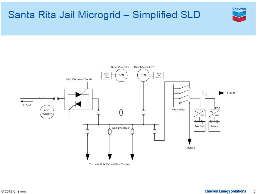 Este proyecto ha sido desarrollado en los Estados Unidos de América. En las figuras pueden apreciar la configuración y las potencias involucradas. Esta es una instalación penintenciaria (cárcel). Implementaron técnicas de control de voltaje y frecuencia. Así como también el tema de predicción de la energía consumida, almacenada, etc. La sincronización y la interconexión con la red externa también. Han desarrollado un protocolo que mencionan es una poderosa herramienta para simplificar la integración de los recursos de generación distibuidos, es decir, ya tienen avanzando algo que luego podría ser comercialmente impuesto.