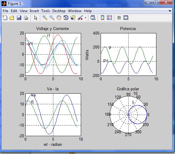 En la figura una muestra de las forma de análiis de un circuito eléctrico dibujando varias curva. Recordar que de cada dibujo, es solo una visualización de los datos que se crean en el Workspace almacenados en variables, de las cuales uno puede extraer los datos para hacer otros análisis más puntuales o precisos. Hecho en Matlab/Simulink.