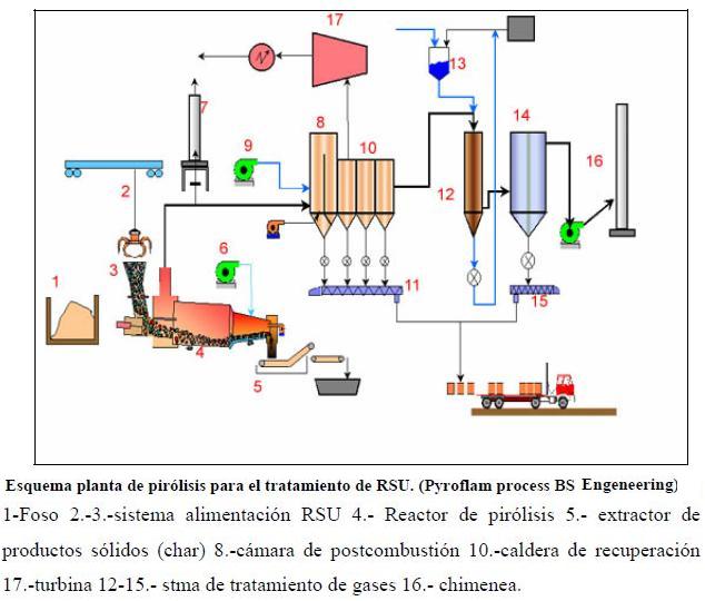 Cuando se aplica al tratamiento de RSU, la acción del calor descompone moléculas complejas en otras más simples, obteniendo como productos finales una sustancia sólida carbonosa (char), líquido y gas. Las proporciones relativas de los mismos dependerán de la temperatura a la que sean expuertos, el tiempo de exposición y la propia naturaleza de los residuos a tratar. Una exposición prolongada a temperaturas moderadas maximizará la producción de char, mientras que la pirólisis “flash” proporcionará un producto líquido en torno al 80% en peso.