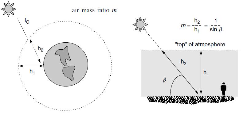 Lo habíamos mencionado en las entradas iniciales de este blog sobre el «air mass ratio» que en el figura se conoce el «m»… y depende de la relación de la longitud de la trayectoria que traza un rayo de sol dentro de la atmósfera y la longitud mínima que se tiene en forma vertical dentro de la atmósfera. Se asume que la superficie es plana. Se esto sale el AM1.0, el AM1.5 , AM0 y casos semejantes que lo hemos simulado en Matlab/Simulink.