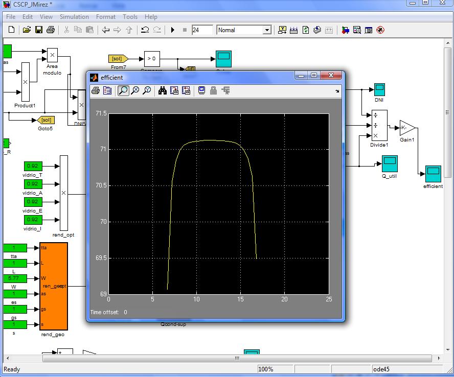 Hola a todos, en anterior post había colocado la presentación que hice sobre CSCP, sin embargo, entre las preguntas del auditorio una fue sobre la eficiencia de la instalación. Algo que fue rápido para mi ajustar el código y el diagrama de flujo para obtenerlo y que os presento en esta entrada. Recuerden que el período de simulación es de 24 horas indicado en el eje horizontal de la figura. Se observa que a cuando amanece la eficiencia se eleva rápidamente hasta alcanzar un valor estable y luego éste decae durante el ocaso del Sol al atardecer. Lo que más me sorprende es que a comparación de la curva de irradiación solar, la curva de la eficiencia es más plana durante mas horas a pesar de los valores de irradiación solar tienen forma de curva gaussiana.