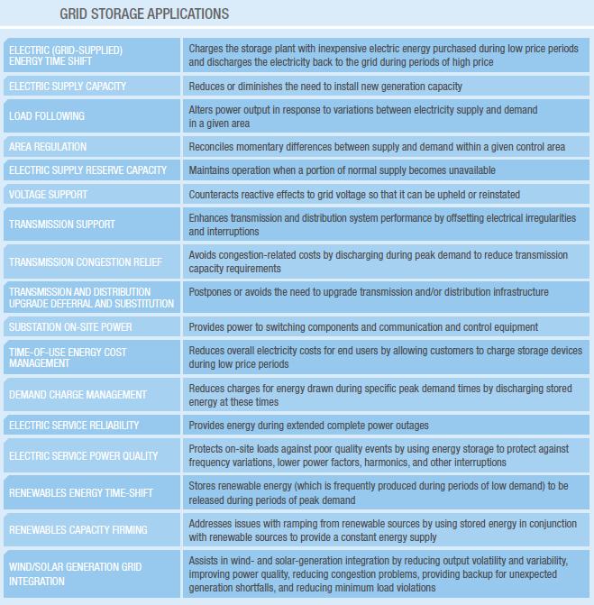 Muchas aplicaciones del almacenamiento de energía se tiene en la actualidad, unas más o menos implementadas, unas más o menos desarrolladas, pero es un tema en constante desarrollo. Algunas tienen que ver con: