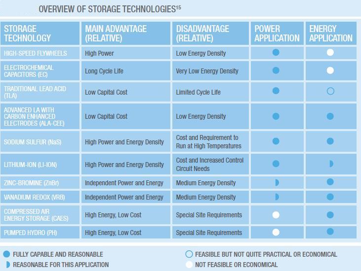 Entre las tecnologías de almacenamiento estan los volantes de inercia de alta velocidad, capacitores electromecánicos, baterias de ácido tradicional, avanzadas baterias de carbón, baterías de sulfuro de sodio, baterías de iones de litio, baterías de bromuro de zinc, baterías de vanadio redoz, almacenamiento de energía por compresión de aire, almancenamiento por hidro-bombeo.