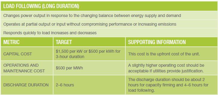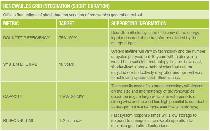 La “roundtirp efficiency” de entre 75% a 90%, que consiste en la eficiencia medida en el transformador a la salida de energía dividida por la energía de ingreso. El tiempo de vida del sistema está en 10 años, y que varían por la tecnología y el número de ciclos al año, pero unos 10 años sometido a alto ciclaje ser un suficiente tiempo de vida. La capacidad del sistema está entre 1 MW a 20 MW, en donde, la capacidad necesaria de una tecnología de almacenamiento puede depender del tamaño y la intermitancia de la operación de las renovables (por ejemplo, una gran granja eólica con períodos de fuerte viento y nulo viento tiene un alto potencial para contribui a la red pero ello podría ser más efectivo con almacenamiento). El tiempo de respuesta es de 1 – 2 segundos, dado que la respuesta rápida permite al almacenamiento responden a los cambios en la operación de las renovables para minimizar las fluctuaciones de la generación.
