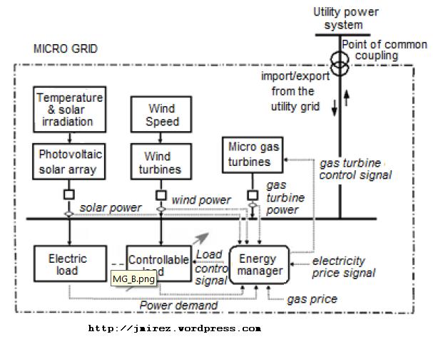 Durante la tesis de maestria hemos trabajado en microgrids… bueno aca les muestro otro diagrama relacionado al tema. Como verán la microgrid esta compuesta por diferentes equipos con sus respectivas variables de entrada como pueden ser la velocidad del viento, irradiación, temperatura, etc. Pero tambien tienen un sistema de gestión de la microgrid que tiene que ver con la evaluación, control y fiabilidad de la energía produdica, generada y consumida.