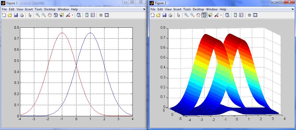 Según los principios del a mecánica cuántica, las partículas elementales son ondas. En esta figura mostramos dos funciones de onda con sus clásicas formas de tipo gaussiano. Sin embargo la probabilidad de estas, es la multiplicación del cuadrado de sus funciones. Entonces la figura muestra tales cosas, y en el de la derecha en especial se muestra la señal de probabilidad mucho mejor que las dos funciones de onda (resultado de una simulación hecha en Matlab).