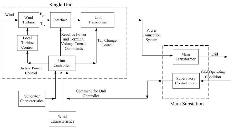 La figura muestra los principales componentes de un parque eólico. Un parque eólico está compuesto por varios aerogeneradores todos o conectados a un mismo transformador o conectado en grupos (cuando la geografía lo permite) a un transformador y estos conectados en paralelo hacia la red eléctrica nacional. Entran a tallar varias variables algunas definidas desde el hardward instalado y otros de mediciones que se hacen de las variables medioambientales y de funcionamiento de la red en el mismo sitio. Las características del viento es un dato importante y que constantemente la dirección y el valor de la velocidad de viento retroalimentan constamente al sistema de control representado por la unidad controladora (Unit Controller). El flujo de información y toma de decisiones al interior del parque eólico se visualiza entre los diferentes equipos que sirven en la producción, adecuación de la energía producida y la interacción con la red eléctrica nacional, en donde existe un ambiente que viene a ser el sistema de supervisor (Supervisory Control Room). Todos estos elementos envuelven muchos temas de estudio y una de las posibilidades que permite la computación ahora es realizar procesos de modelamiento y simulación de estos sistemas… en lo personal lo hago usando Matlab/Simulink